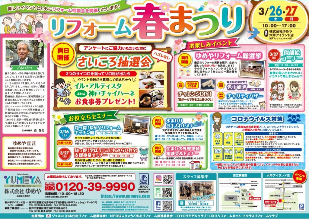 今月26日(土)と27日(日)、恒例の《リフォーム春まつり》を開催いたします!!今回も、暮らしに役立つセミナーや、楽しいイベント盛りだくさんご用意してお待ちしております。