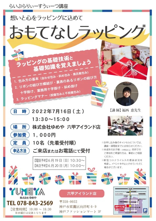 7月の『らいぶらりーすうぃーつ講座』は、” 想いと心をラッピングに込めておもてなしラッピング ” です!