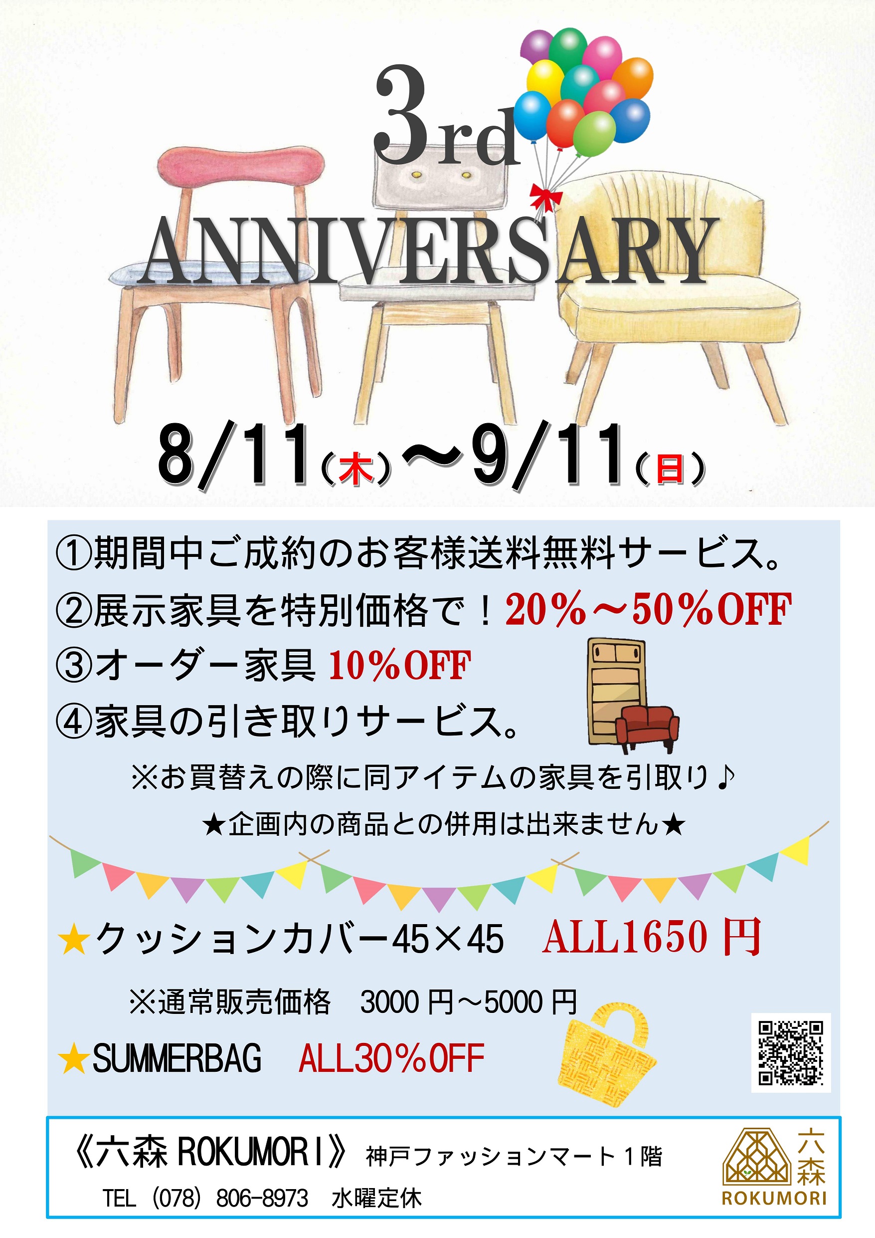 六森はおかげさまで夙川から六甲アイランドに移転してから8月10日をもちまして3周年を迎える事が出来ました。