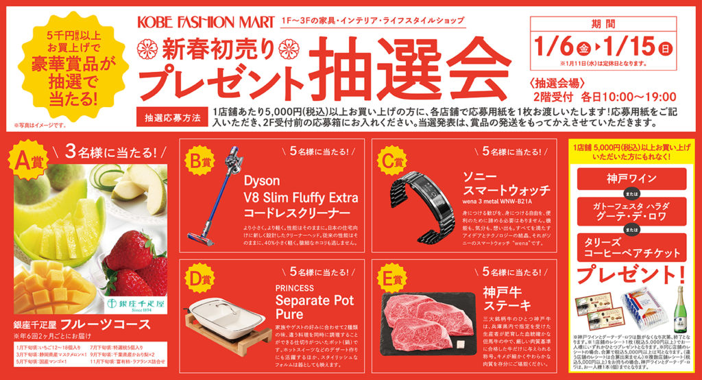 神戸ファッションマートでは、2023年1月6日(金)~1月15日(日)[※1月11日(水)は定休日]の期間、各テナントで新春初売りを開催しております!