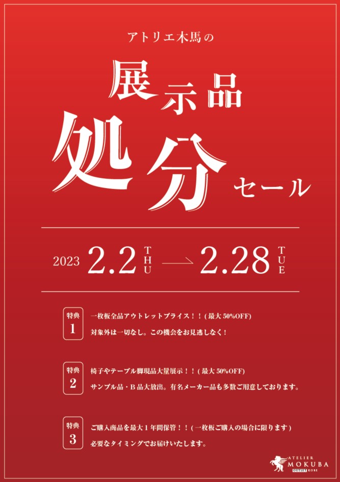 1F:ATELIER MOKUBA アウトレット神戸店 では、2月28日(火)までの期間、《 展示品処分セール 》を開催中です!