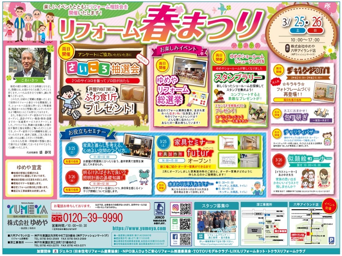 3月25日(土)と26日(日)、恒例の《リフォーム春まつり》を開催いたします!!今回も、暮らしに役立つセミナーや、楽しいイベント盛りだくさんご用意してお待ちしております。