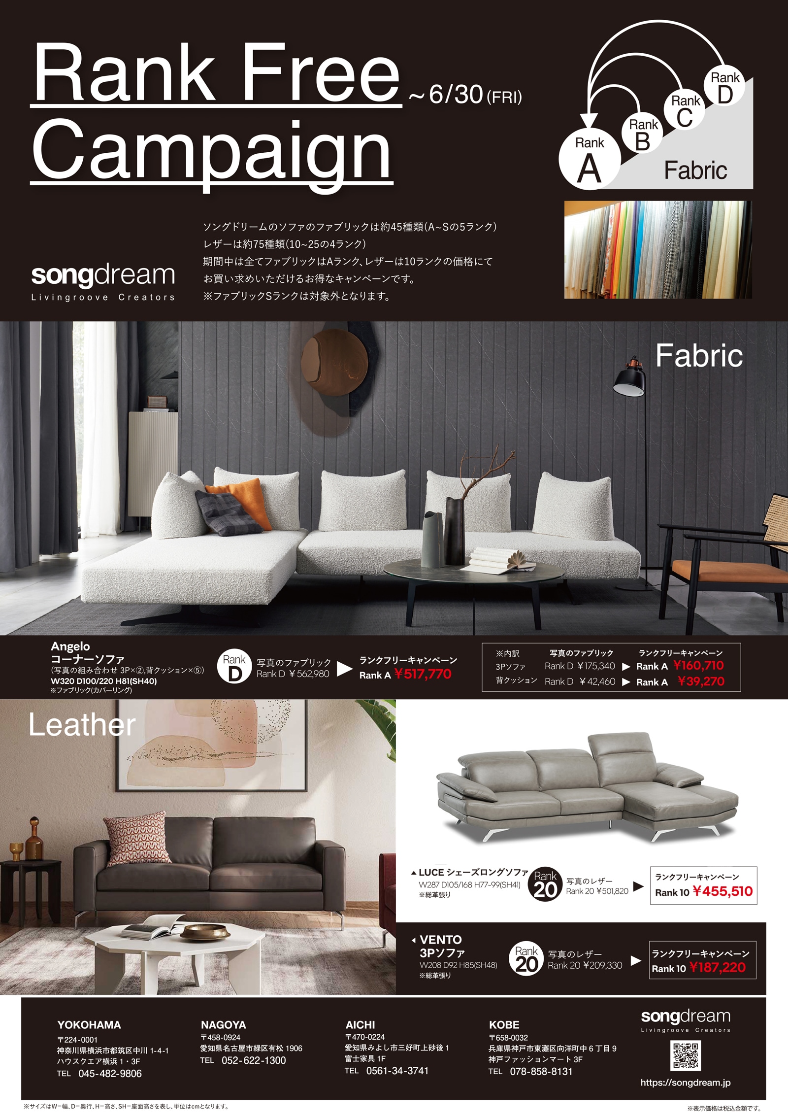 期間中は全てのファブリックはAランク、レザーは10ランクの価格にてお買い求めいただけるお得なキャンペーンです!!