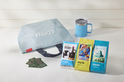コーヒー産地のイメージを描いたカラフルなパッケージの限定コーヒー豆や、