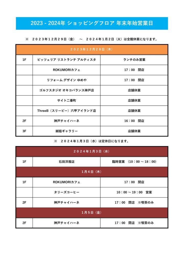 その他、各日の営業時間に変更がある店舗は下記をご確認下さい。記載が無い店舗に関しては、1月4日(木)~通常営業となります。