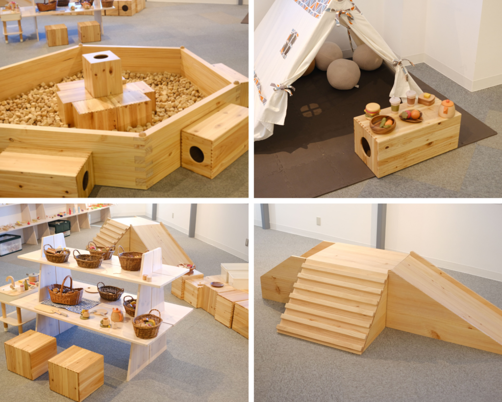 おままごとセットやキッチンだけでなく、木の遊具【砂場】【すべり台】【小さな隠れ家】など、自由に遊べる楽しい空間をご用意しています!