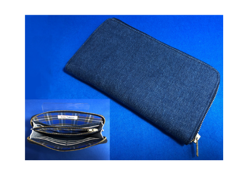 表側が岡山デニム、内側が神戸タータンの播州織のコラボ商品です。デニムは旧式のシャトル織機の証し、赤耳(セルビッジ)がついています。
